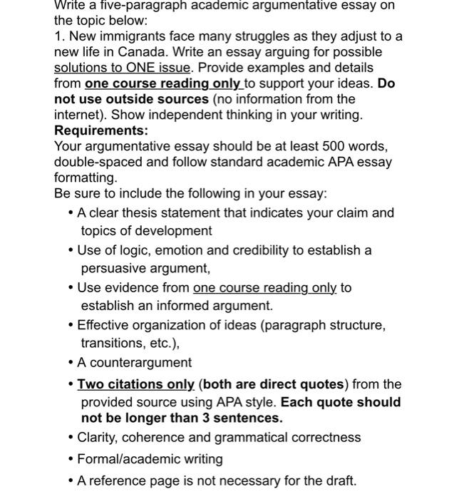 Write A Five Paragraph Academic Argumentative Essay Chegg Com